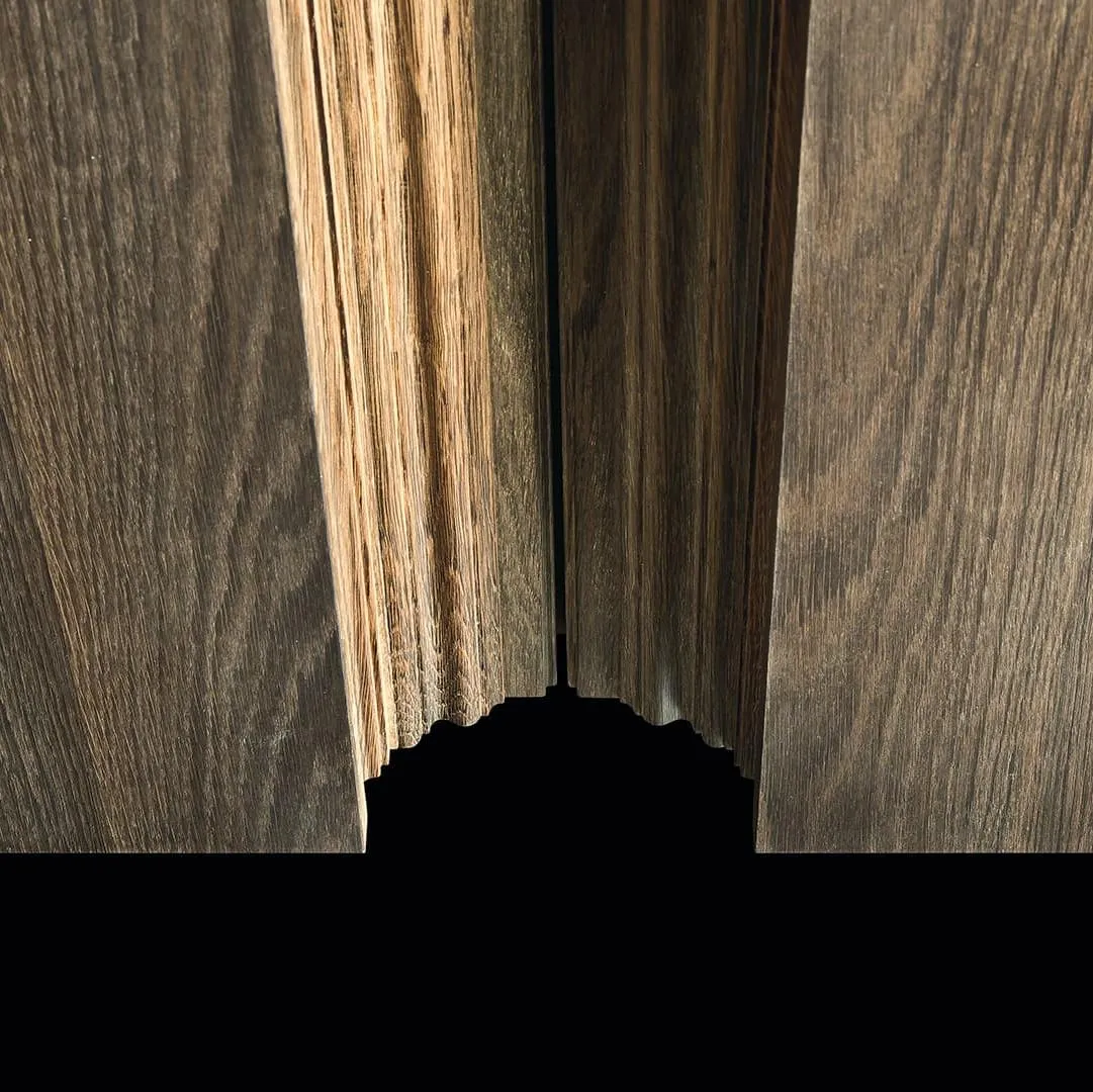 Термообработанная древесина по нашим образцам, болотный дуб и болотный вяз, масляная отделка натуральным воском и водой. Полки – Бронзовое закаленное стекло толщиной 1 см.