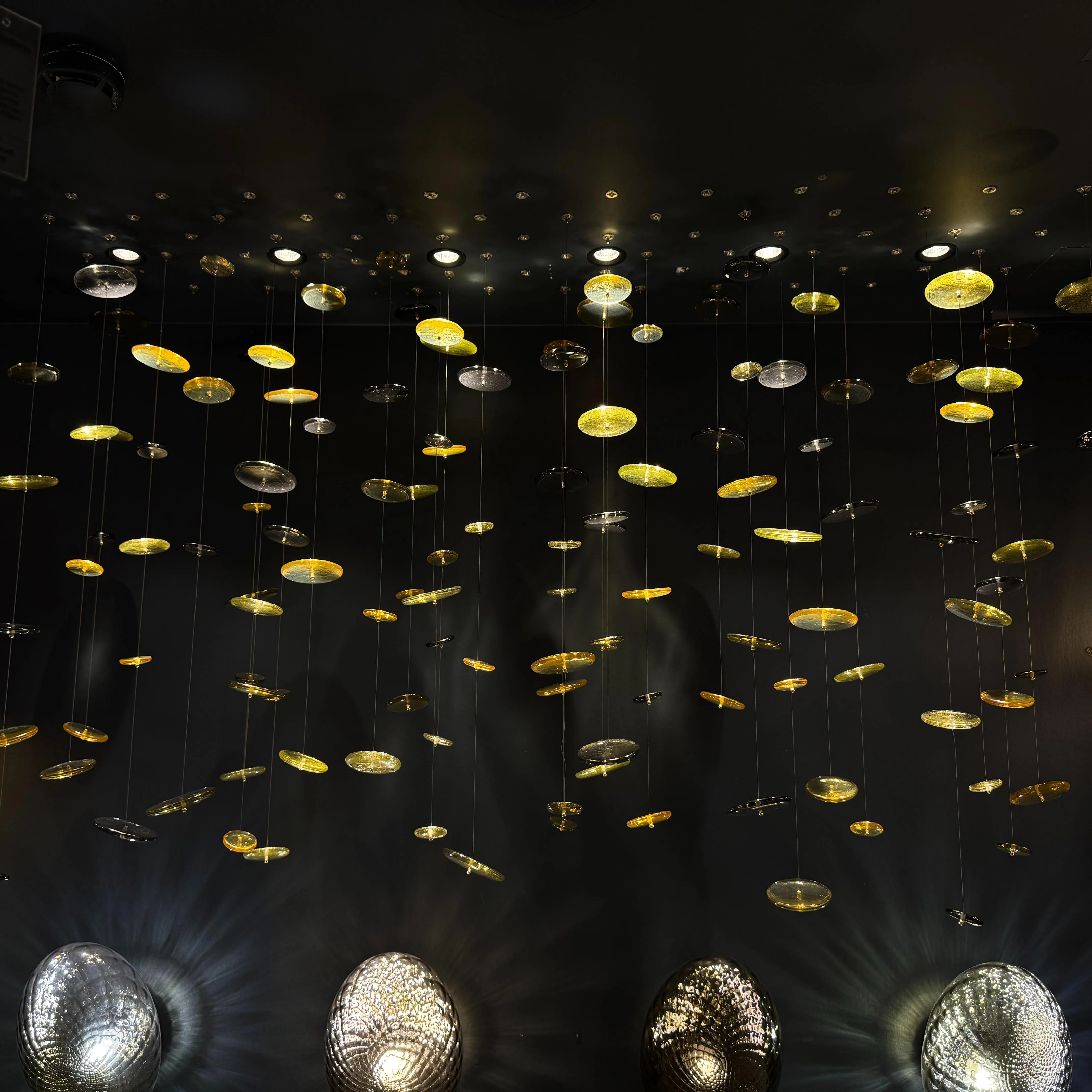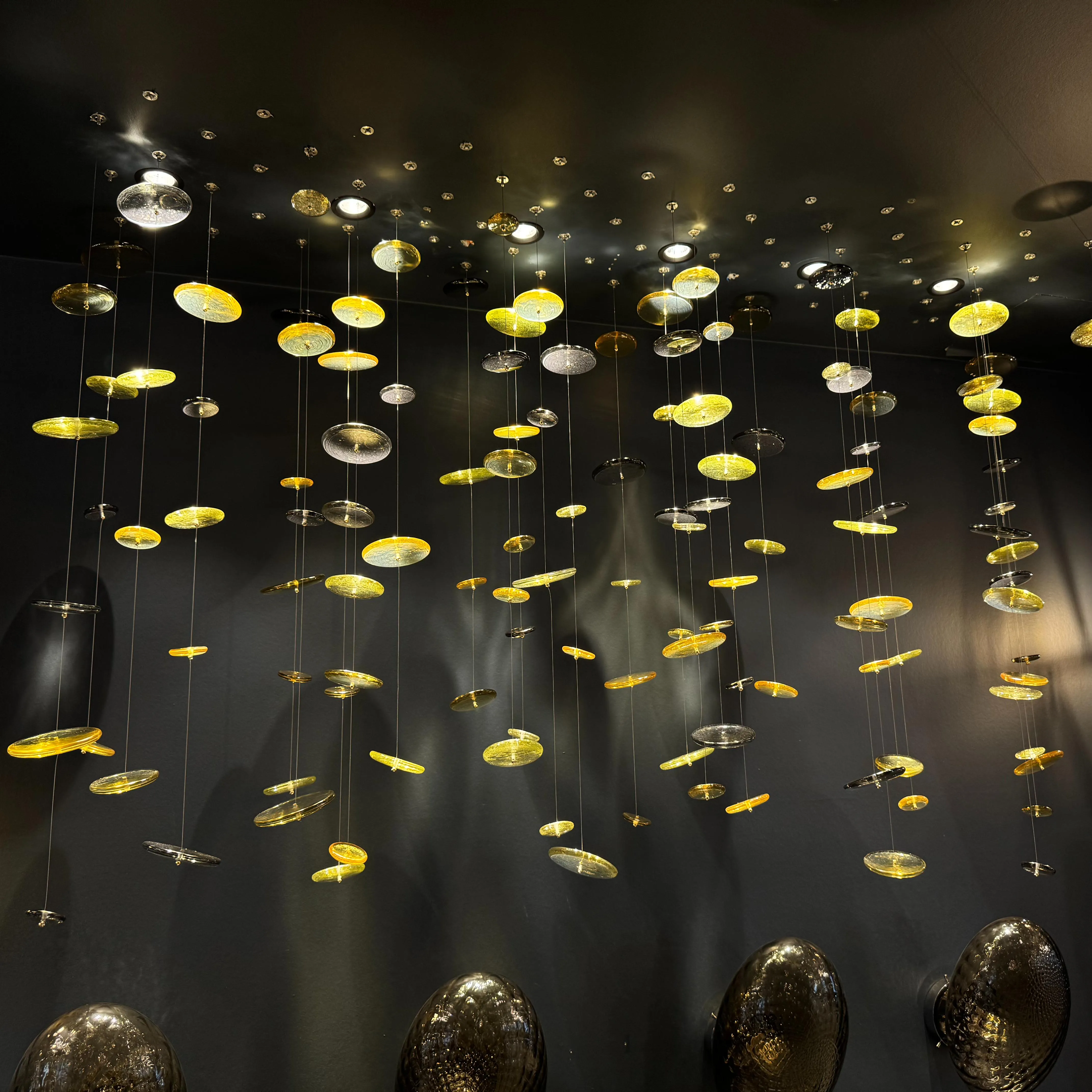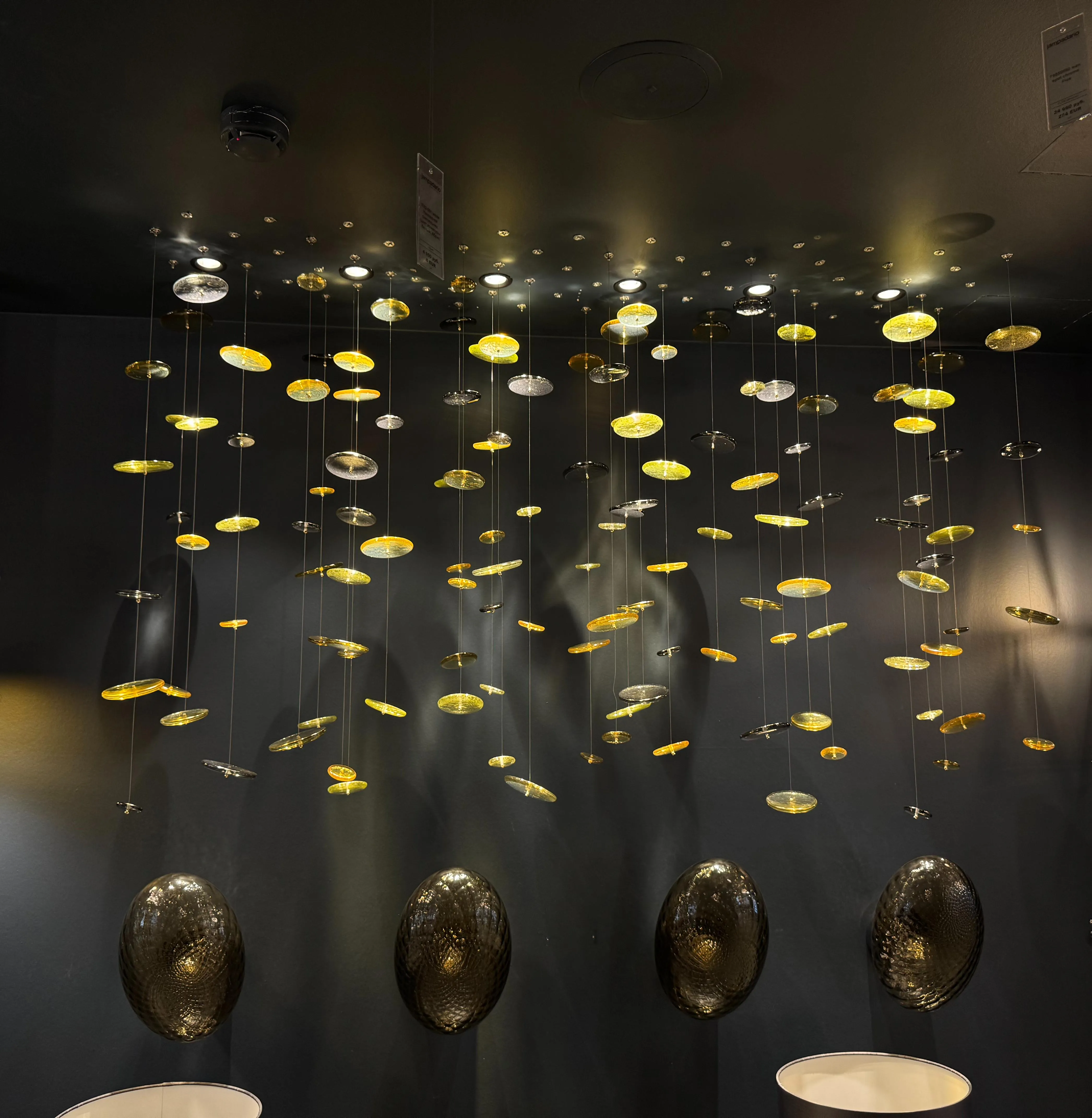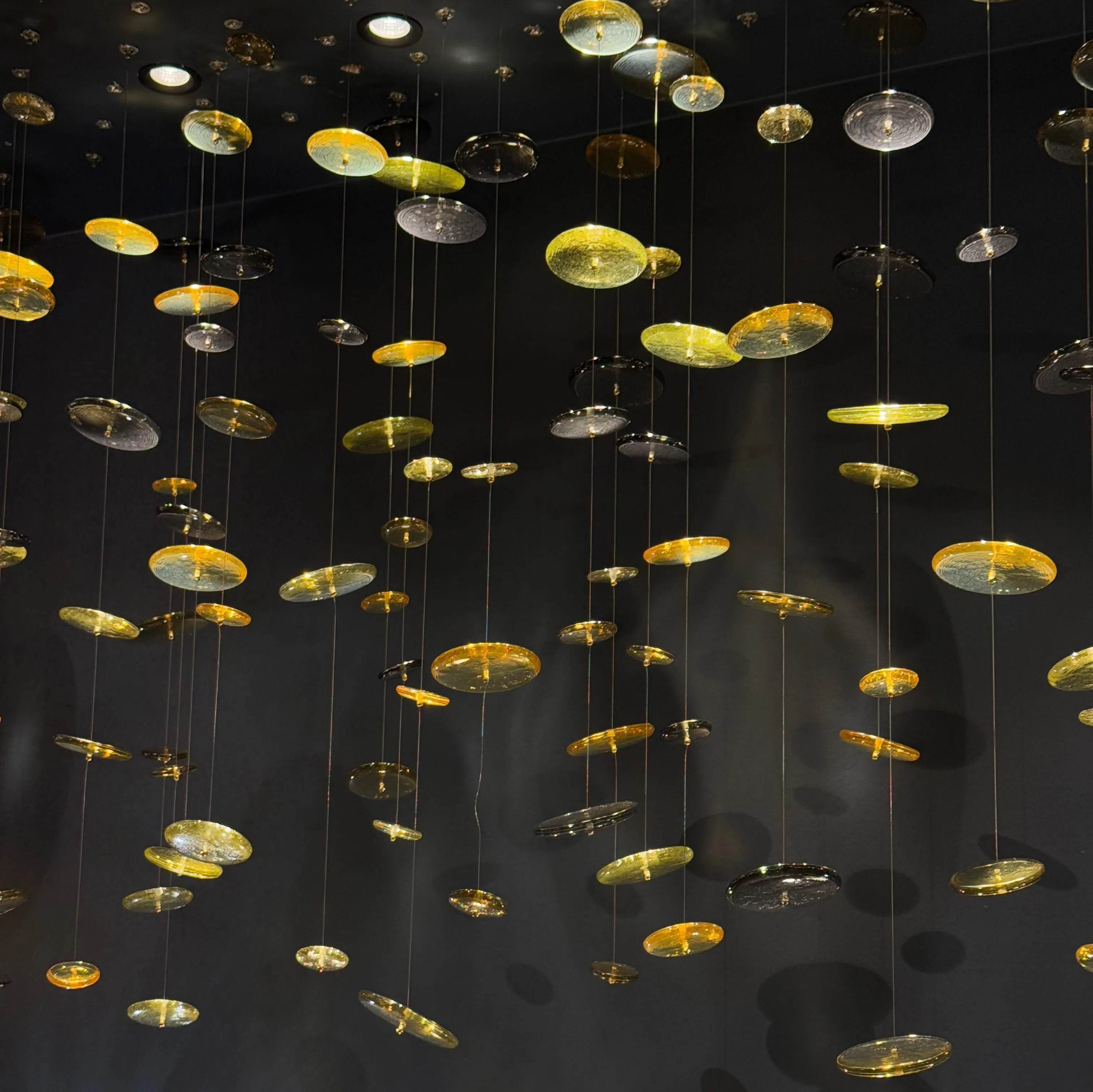 Волнистые диски, выполненные вручную из выдувного стекла, создают игру света и тени, напоминая движение водных растений.