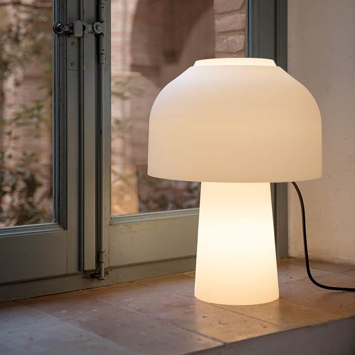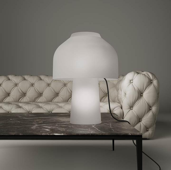 Прозрачная вуаль из выдувного стекла, выполненная таким образом, чтобы подчеркнуть двойное расположение светильников внутри основания и абажура. Она создает общий вид матового белого стекла, из-за которого трудно отличить основание от абажура. Корпус лампы из дымчатого стекла. Рассеиватель из прозрачного стекла для рассеивателя
