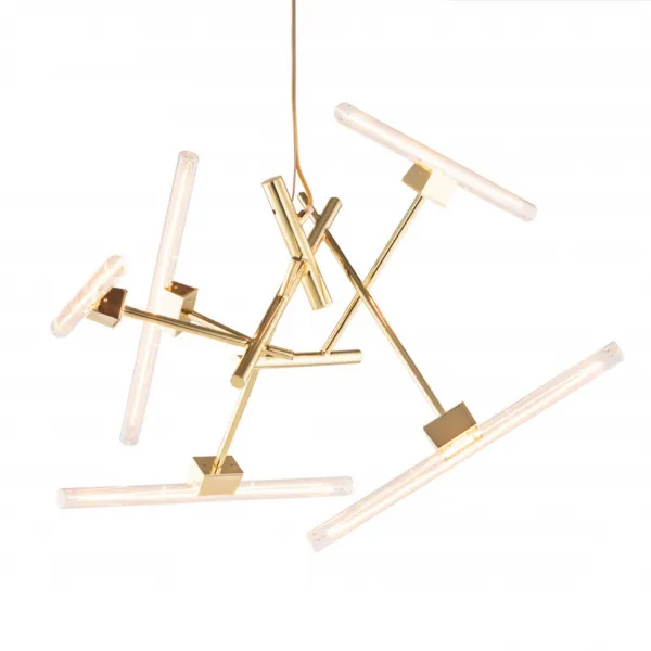 Дизайн светильника точно продуман и геометрически обоснован. Тонкие трубки из металла соединены в хаотичном порядке и подвешены в воздухе на тонкие подвесы. Часть трубок оснащена встроенными светодиодами.