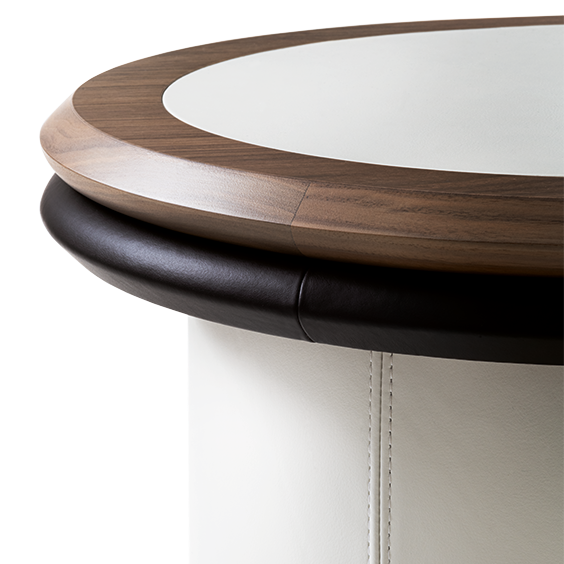 Консоль со столешницей из орехового дерева Canaletto и кожаной вставкой. Конструкция с двумя цилиндрическими основаниями: кожаное основание, сочетающееся со вставкой