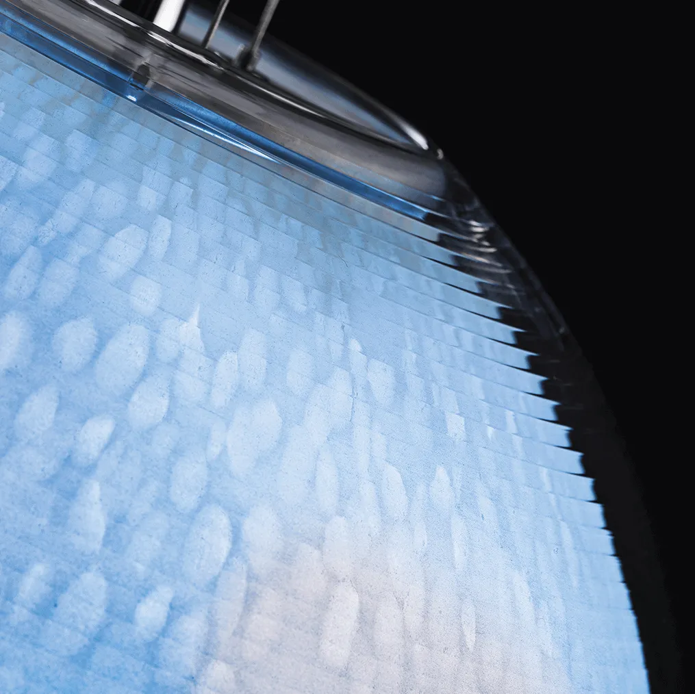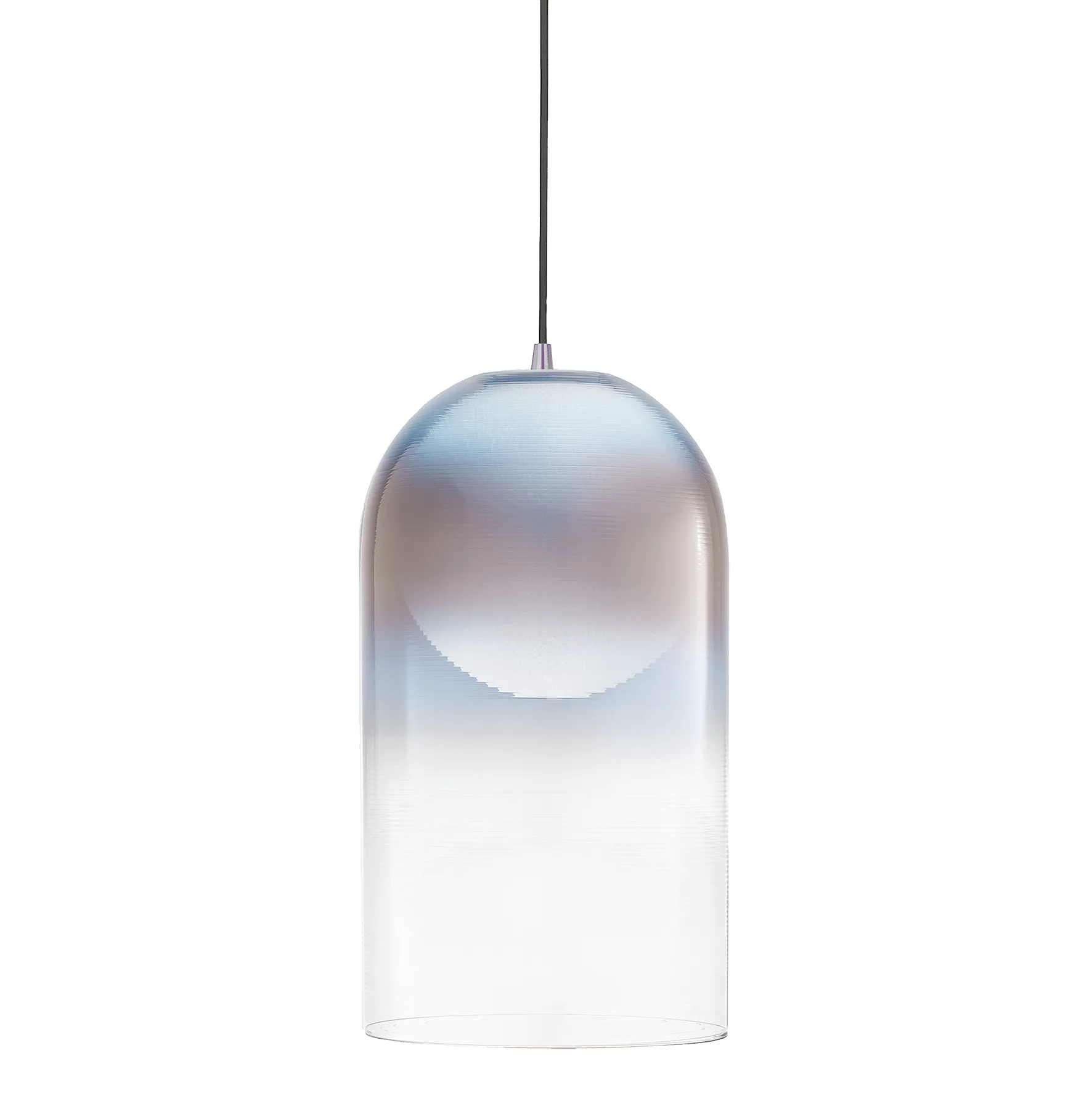 Подвеска из выдувного белого стекла, заключенная в прозрачный прямоугольный купол с медным оттенком. Хромированная металлическая конструкция.