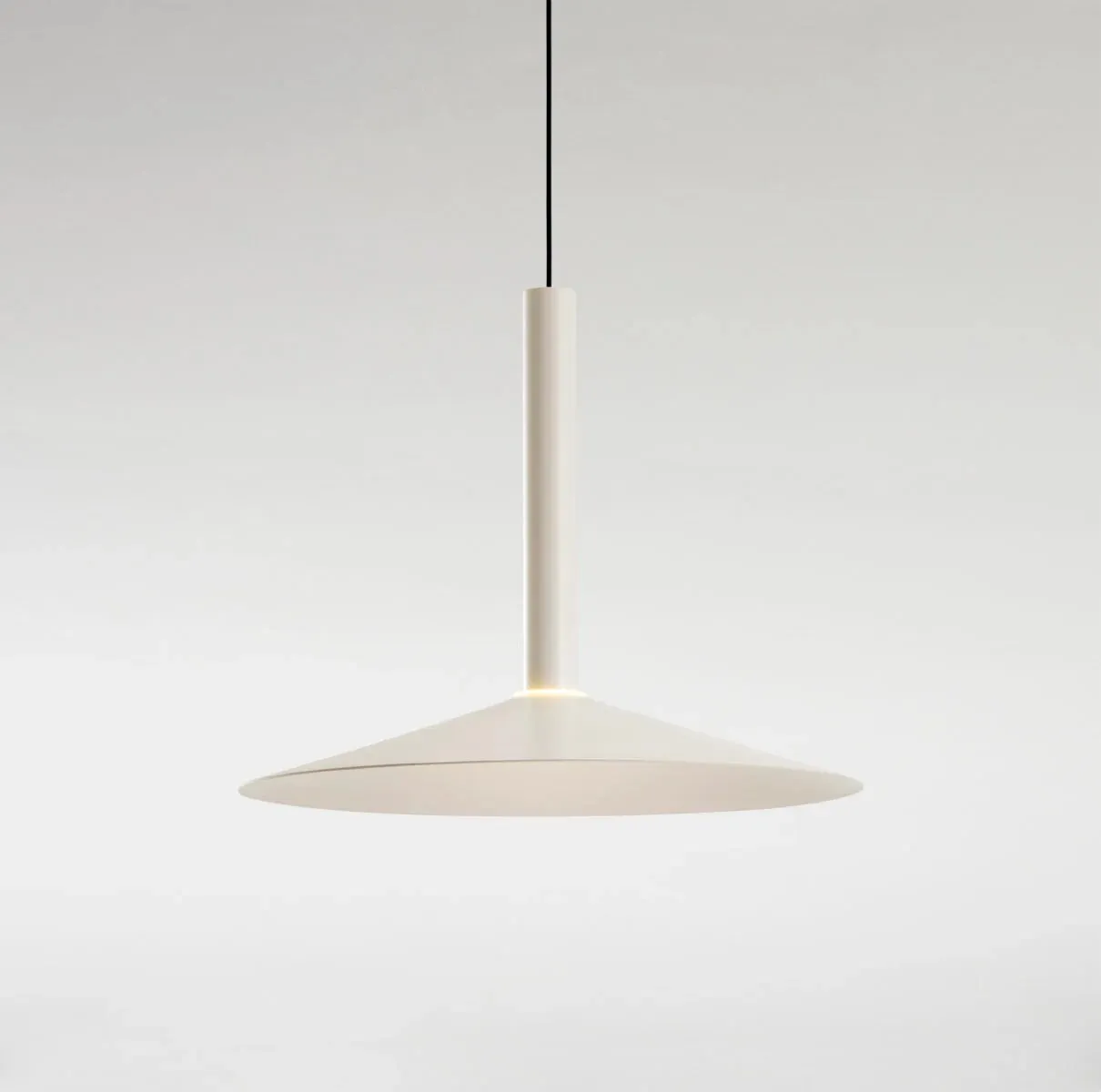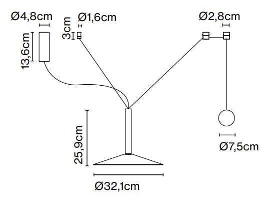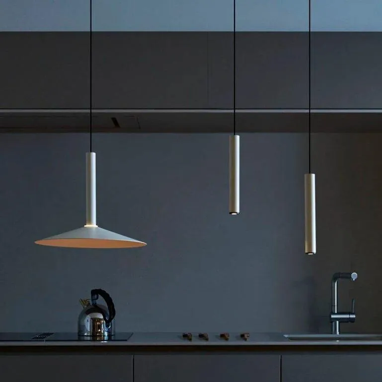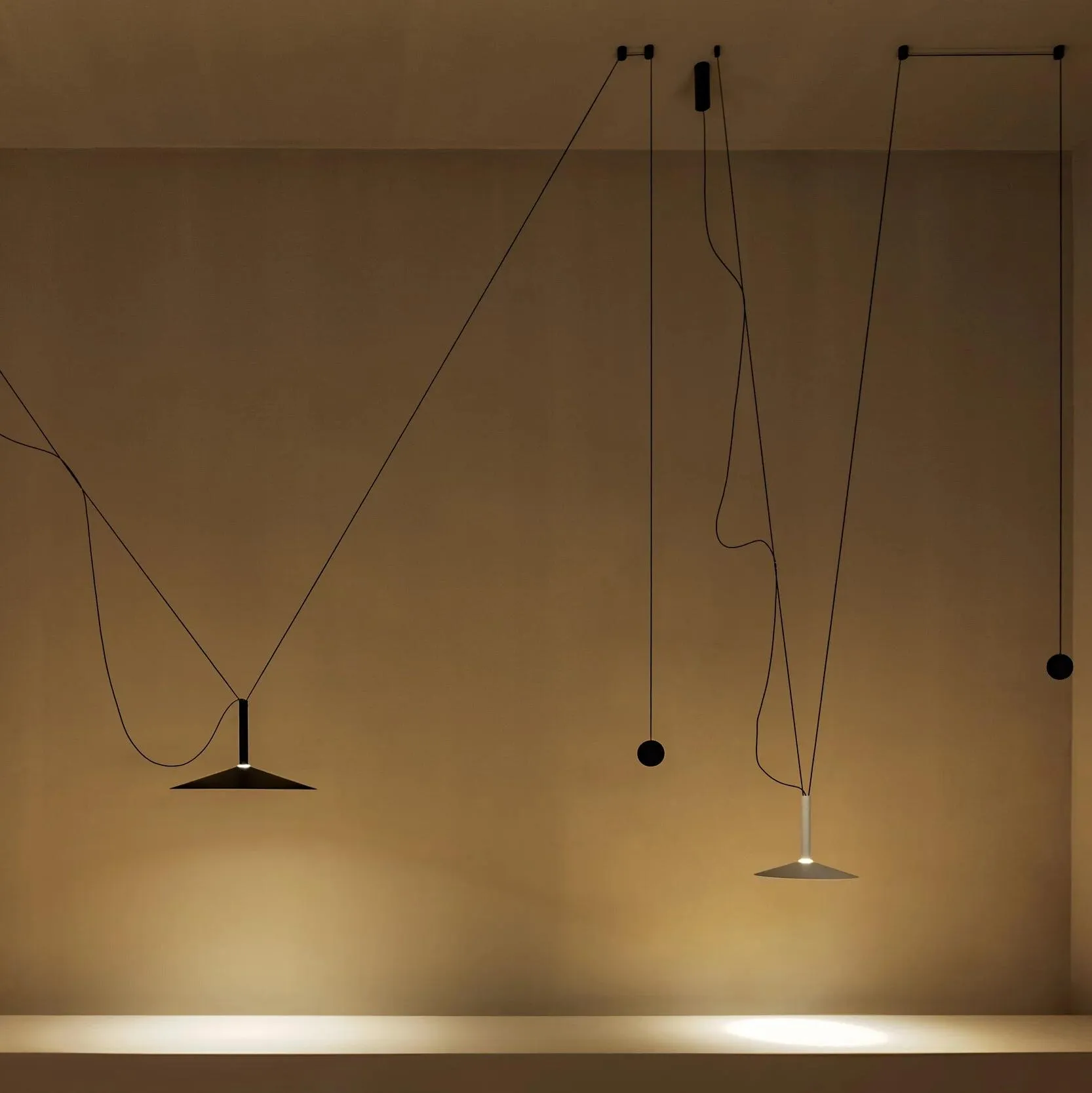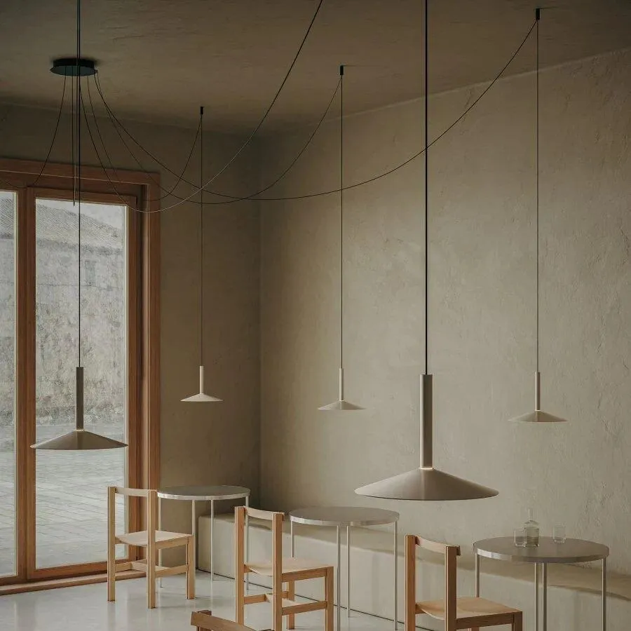 Парадоксально, но этот новый дизайн начинается с деконструкции архетипа лампы; максимально синтезируя его, остается только цилиндрический корпус со встроенным светодиодом. К этому цилиндру мы можем добавить различные конусообразные плафоны в устрично-белом и черном цветах нескольких размеров. Но самым оригинальным из всего этого является то, что каждая из этих ламп может иметь простой противовес, так что, когда они подвешены между двумя точками, их можно перемещать.