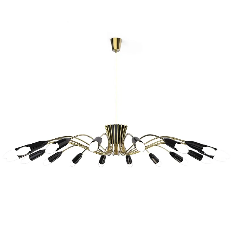 Эта современная люстра представляет собой идеальное сочетание современного минимализма и ретро дизайна. Небольшие плафоны светильника NORAH в сочетании с голыми лампочками, а также изящные изгибы его глянцевых лучей создают тот самый образ из середины прошлого века.