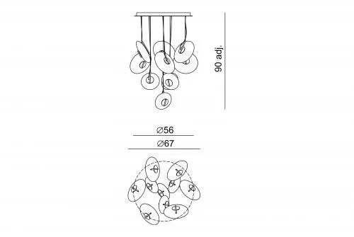 Подвесной светильник из дутого стекла и металла. Плафон из нержавеющей стали с десятью световыми точками из толстого прозрачного дутого стекла разных размеров с "баллотоновой" и "ребристой" текстурой. В плоском сферическом стекле размещены светодиодные источники света мощностью 5 Вт, каждый из которых имеет внутренний рассеиватель и металлическую крышку с декоративным стержнем. Световые точки подвешены на стальном тросе регулируемой длины. Металлические детали доступны в различных вариантах отделки.