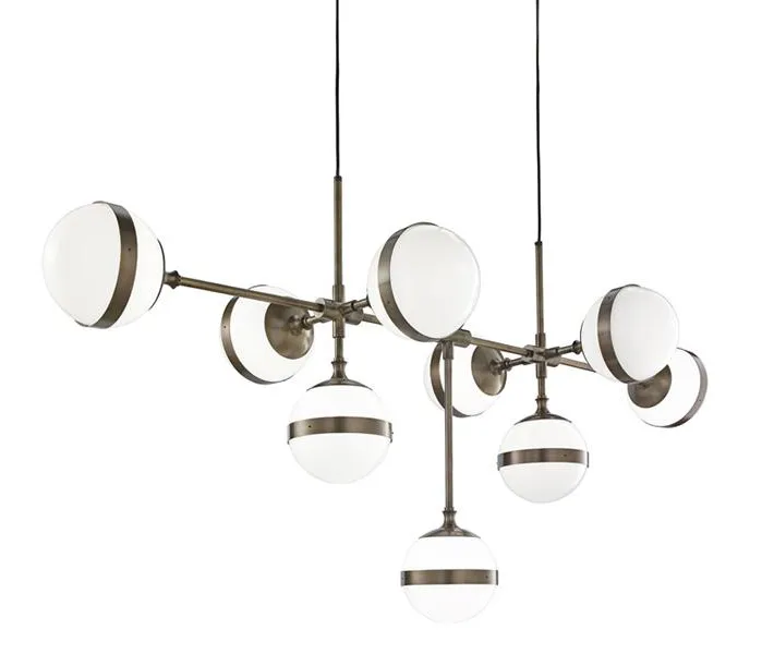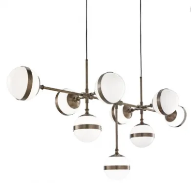 Люстра подвесная. Выполнена из металла в отделке состаренная латунь. Плафоны из выдувного стекла белого цвета.