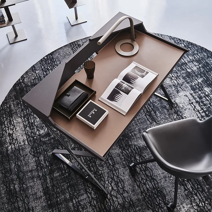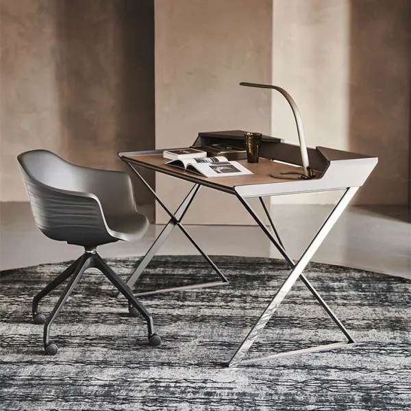 Выделяющийся геометрическими линиями, создающими ощущение тщательно продуманного баланса, дизайнерский письменный стол Qwerty, как будто, парит над тонкими стальными ножками, скрещенными в форме X. Кожаная накладка, доступная в различных цветах, дополняет стальную поверхность, делая ее удобной и элегантной.