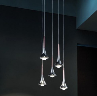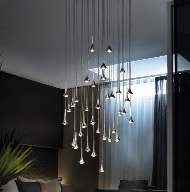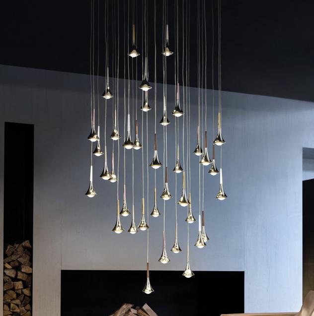 Светильник подобен каплям весеннего дождя, падающим с потолка. Линейное движение подчеркивает округлые конические формы его корпуса.