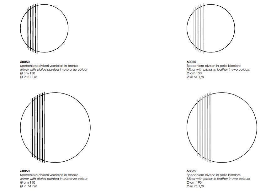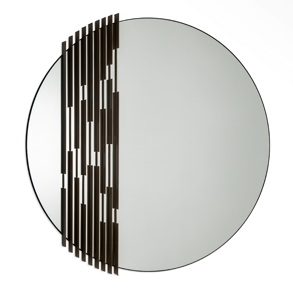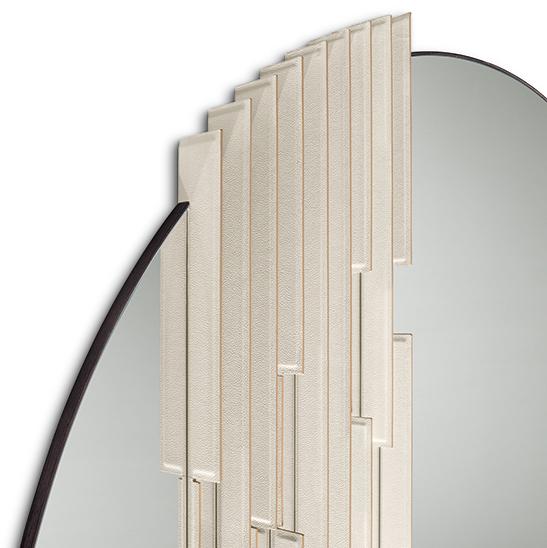 Настенное зеркало с боковым профилем из массива ясеня, имеющее антрацитово-серую отделку. Зеркало разделено небольшими накладками, выполненными из кожи двух цветов или окрашенными в бронзовый цвет, и может быть установлено справа или слева.