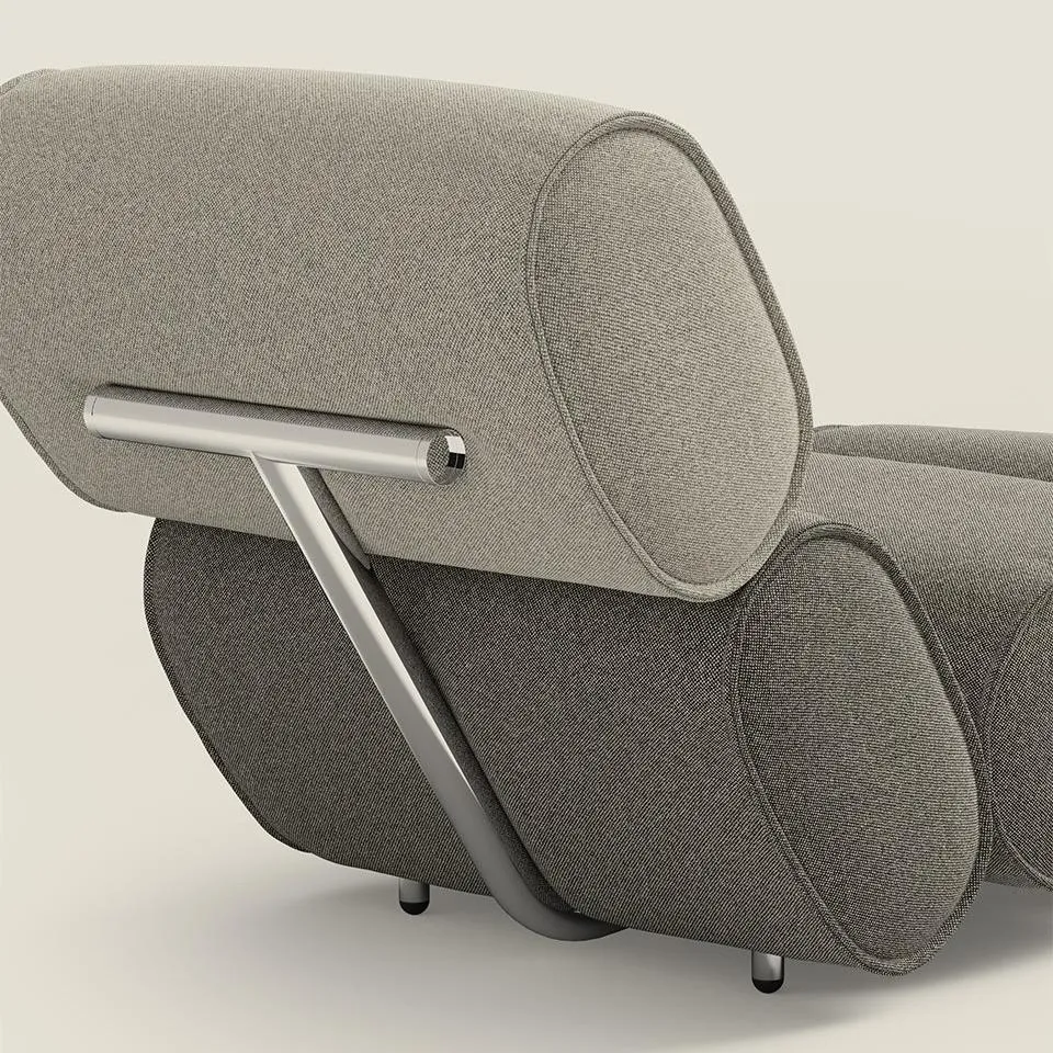 Формы формируются вокруг сидящего человека, оживляя изделие, которое не только радует глаз, но и притягивает к себе благодаря изысканной отделке и специально подобранным швам, подчеркивающим его формы. Металл, необходимый как с эстетической, так и с технической точки зрения, выполнен в форме круглой трубы, которая образует в пространстве опорный каркас, элегантно поддерживающий подушки сидений.