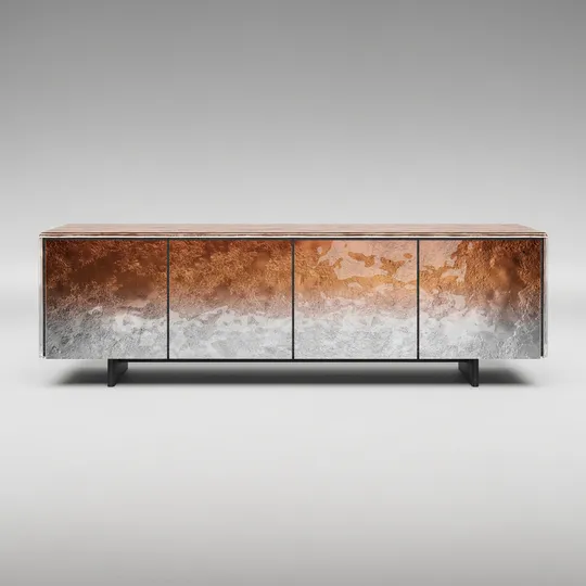 Буфет Scoio из литого стекла/ Декор из двухслойного запечённого стекла с неровными краями. Все элементы окрашены в градиентный цвет от бронзового до прозрачного, а также посеребрены с лёгкой античной отделкой на задней стороне.