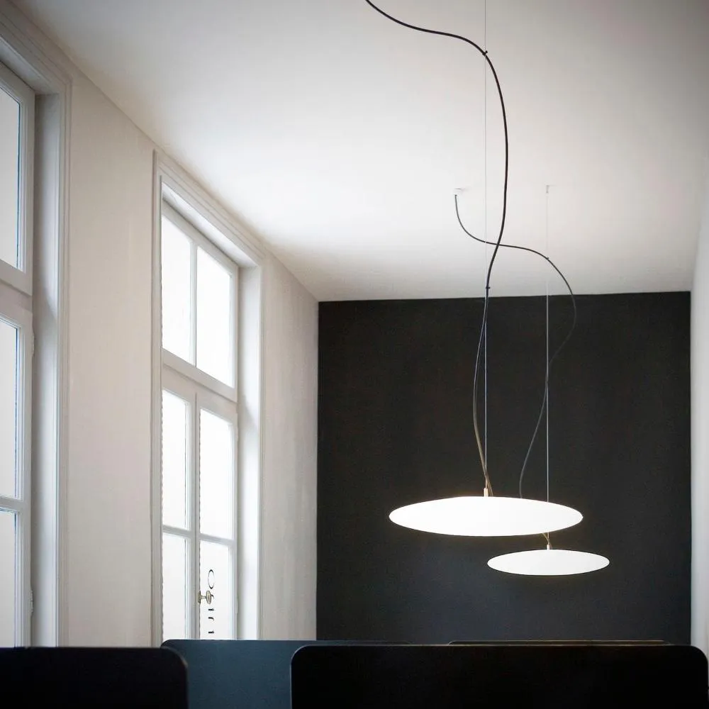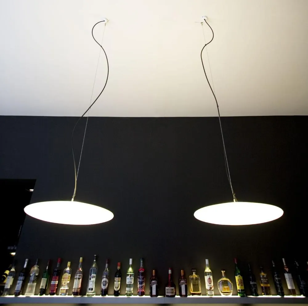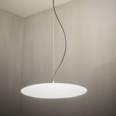 Круглый подвесной светильник выполненный из белого пластика.