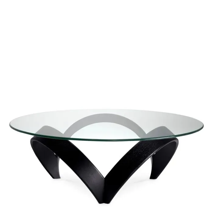Деревянная рама, облицованная черным шпоном, искусно видна под прозрачной стеклянной столешницей, гармонично сочетая округлое изящество с современным дизайном. Это культовое изделие от уважаемого мебельного бренда ручной работы станет центральным элементом любого современного жилого пространства.