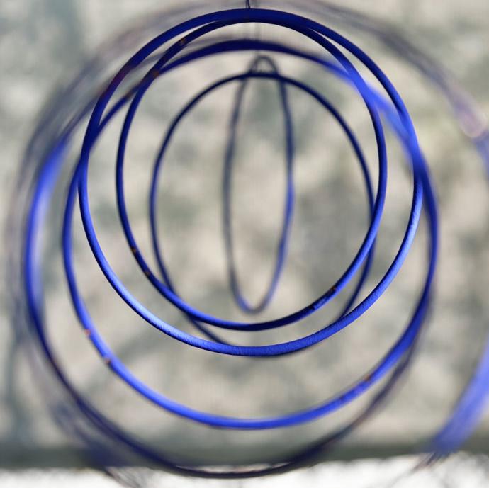 основание и ножка окрашены в черный цвет, медные кольца ручной росписи синего цвета, синие провода, черный диммер.
