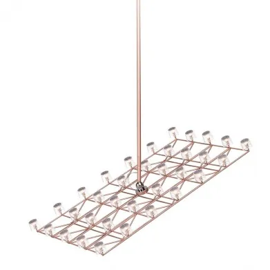 Основа светильника - геометрическая решетка из меди или никеля, дополненная прозрачными гранеными плафонами.