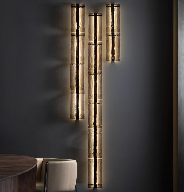 Светильник похожий на световую скульптуру: текстурированные плитки из выдувного стекла чередуются по вертикали вдоль стены в игре бесконечных переливов и нюансов света и прозрачности и отражений.