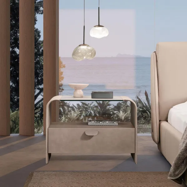 Выдвижной ящик с мягким закрыванием, обтянутый кожей, и элегантной ручкой создает изысканную атмосферу, гарантируя при этом высокий уровень функциональности.