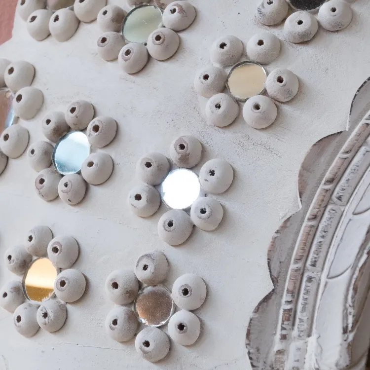 Дизайнерское зеркало белого цвета Peacock Oval - White wash - Zenza - это уникальный предмет декора для вашего дома. Зеркало с зеркалами на стене - дизайнеры Зенза сами влюблены в свое творение! Зеркала линейки Пикок Овал вдохновлены павлиньими перьями, раскрывшимися в распушенном хвосте птицы. Замысловатые деревянные детали декоративной рамы зеркала Peacock Oval украшены маленькими круглыми зеркальцами. Каждая деталь выполнена вручную, поэтому ваше зеркало Peacock Oval White wash не будет похоже ни на одно другое.